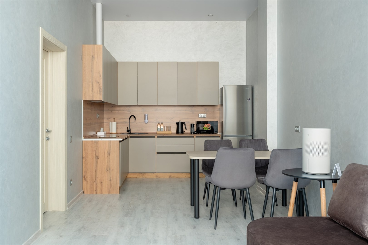 Современная кухня с необходимой бытовой техникой и посудой для приготовления пищи.