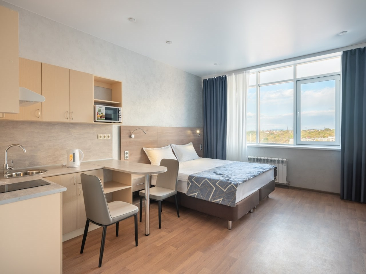 Основным отличием данного номера от студии стандарт, является увеличенная жилая площадь. Уютный номер категории " Студия комфорт double " предназначен для комфортного размещения двух или трех гостей. Эти апартаменты сочетают в себе стиль и функциональность, предлагая следующие удобства: