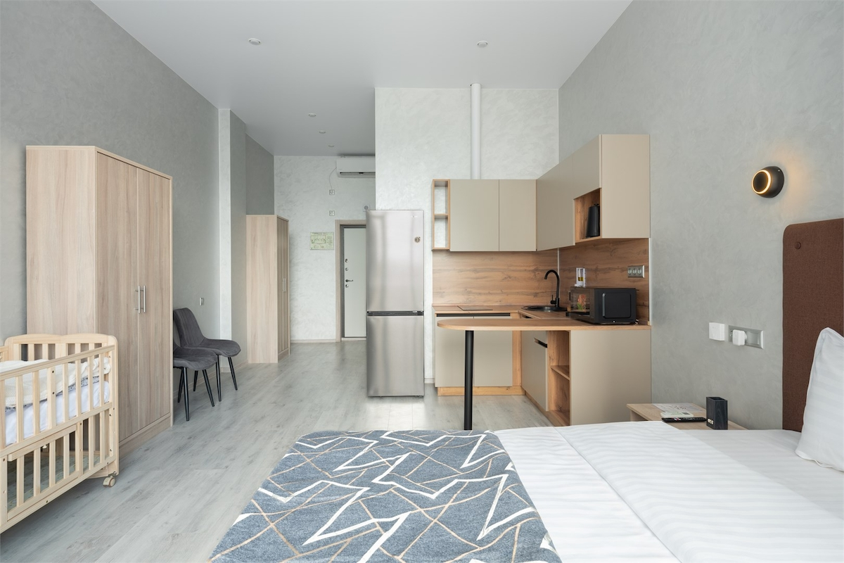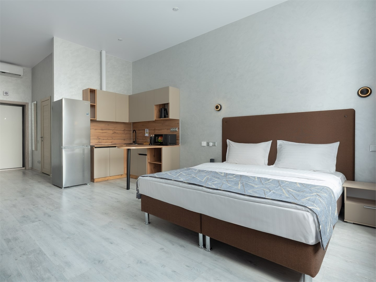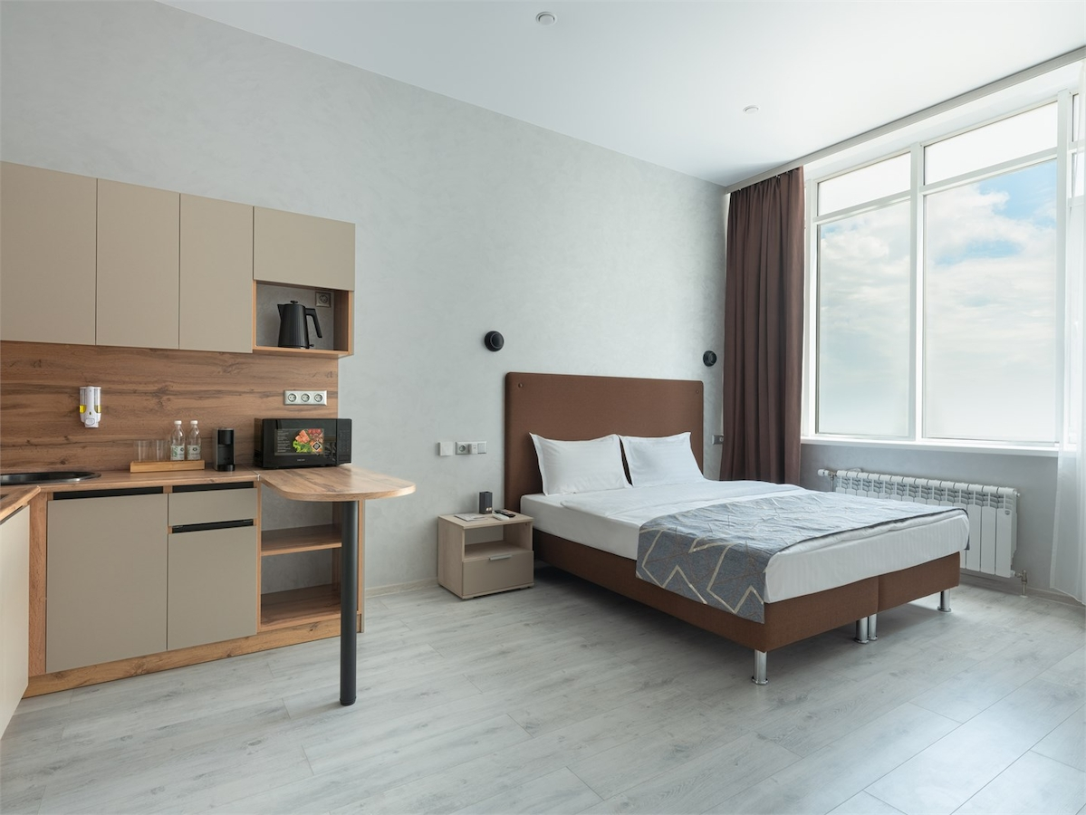 Номер категории "Студия комфорт Plus". Основным отличием данного номера от студии стандарт, является как увеличенная жилая площадь, так и отличительные интерьерные решения. Уютная студия категории "Студия комфорт Plus" предназначена для комфортного размещения двух или трех гостей. Эти апартаменты сочетают в себе стиль и функциональность, предлагая следующие удобства: