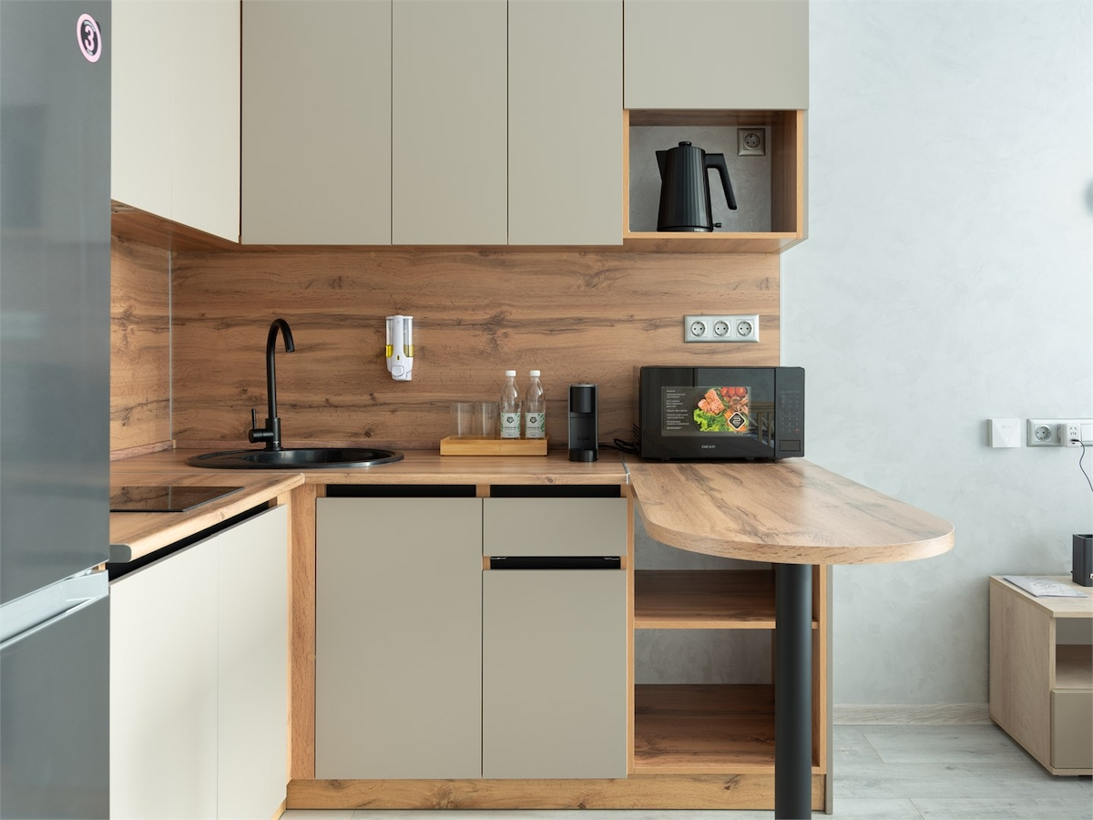 Современная кухня с необходимой бытовой техникой и посудой для приготовления и приема пищи.