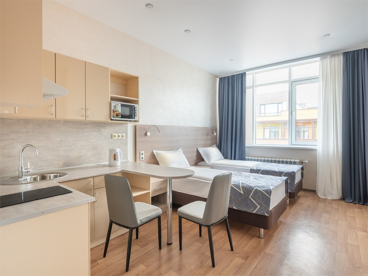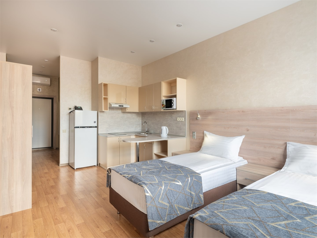 Уютная студия предназначена для комфортного размещения двух гостей. Эти апартаменты сочетают в себе стиль и функциональность, предлагая следующие удобства: